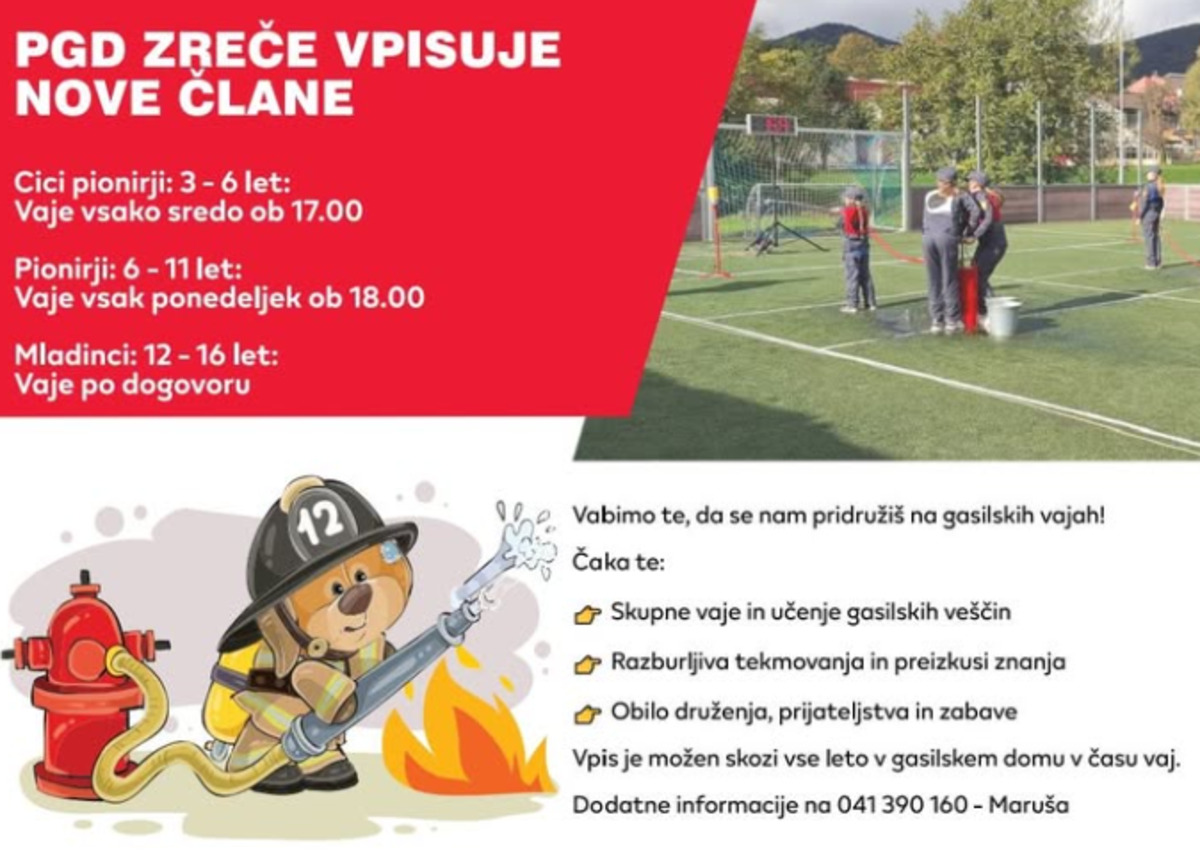 Prostovoljno gasilsko društvo Zreče vpisuje nove člane. Vabimo te da se pridružiš. Čakajo te skupne vaje in učenje gasilskih veščin, druženje tekmovanja in še in še...Dodatne informacije v gasilskem domu ali pri Maruši 041 390160.